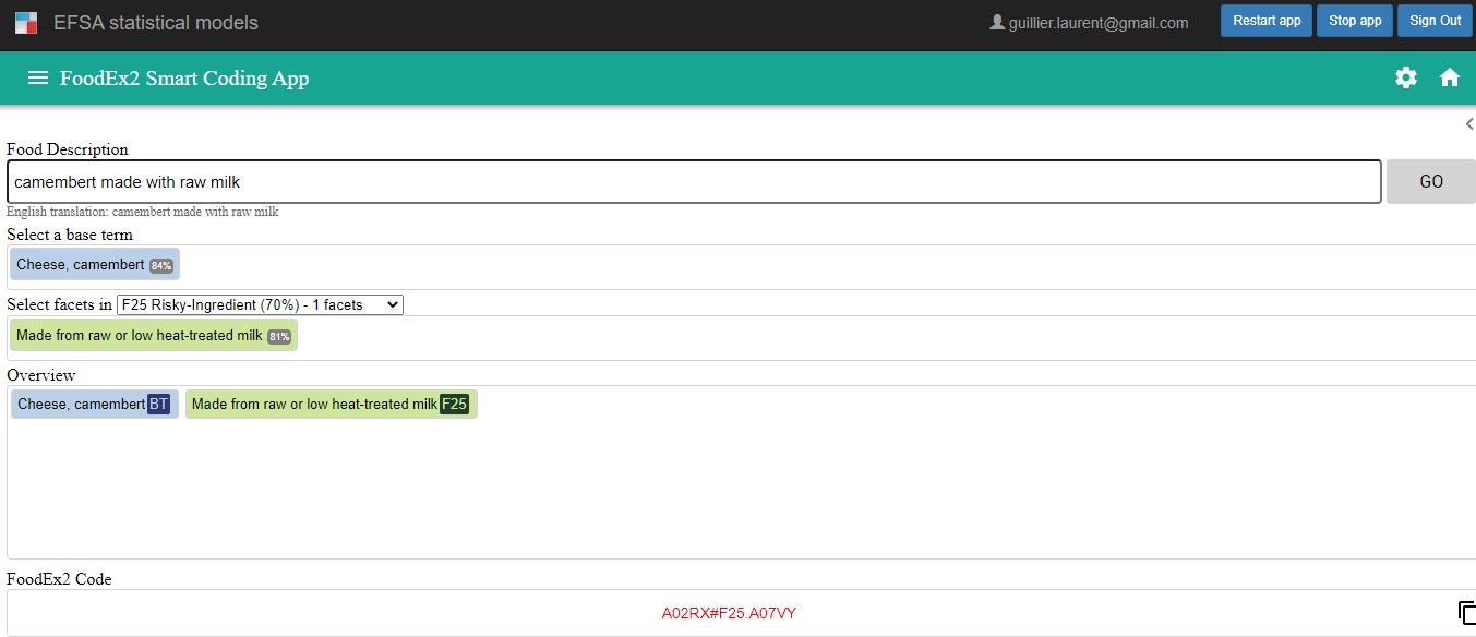 Another way to access FoodEx2 is to use the EFSA FoodEx2 Smart Coding Application. It can be accessed in the R4EU platform (users should register). The tool aims to simplify the coding process by making use of AI techniques. Starting from the food description given as input, the tool provides suggestion of complex FoodEx2 terms (combination of base term and facets). Figure 3.1 shows an example of use of EFSA-SCA.